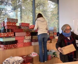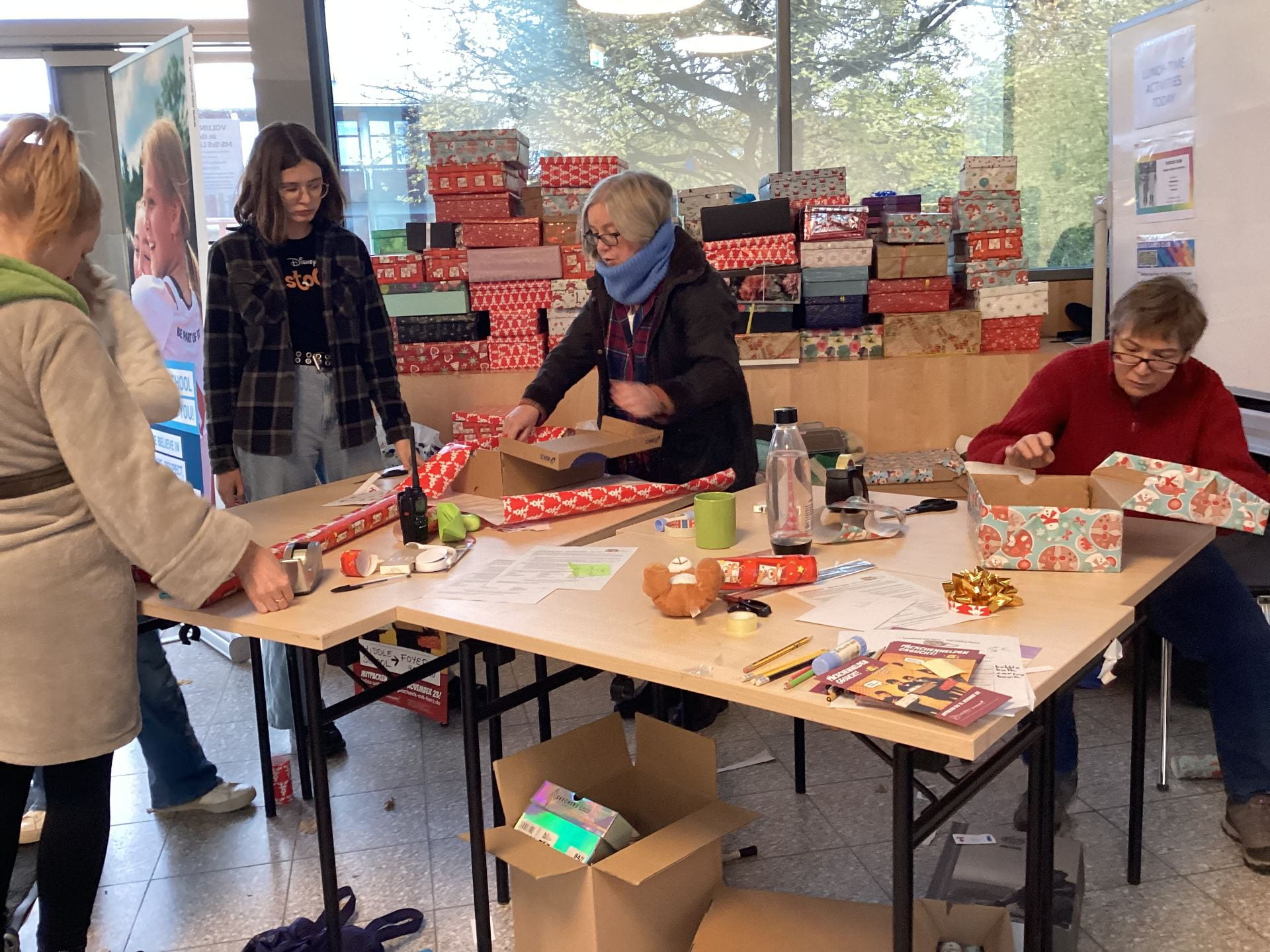 If you stopped by the Middle School Foyer from the 6th to the 10th of November, during homeroom, lunch, or break, you would most likely have seen a dedicated team of 8th grade volunteers and teachers receiving, arranging, and wrapping colourful gift boxes- 136, in fact. Now, if you didn’t realise what this was for,(despite the rather energetic marketing,), here’s your chance to find out. The Geschenk mit Herz project was an effort to collect gift boxes to donate to children in need, a project led by 8th graders and assisted by Ms. Healy. So, to contributors, volunteers, and Ms. Healy, thank you, and a very happy holiday season. You certainly made someone else‘s holidays quite enjoyable.