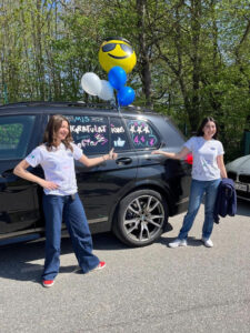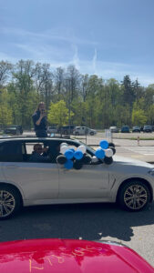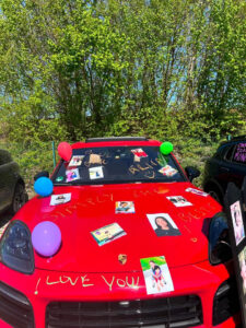 Arita A.’s car decorated with ballons and photos of her. Many cars are decorated with younger photos of the graduates on their last day. (Jacob N./Buchhof Bulletin)