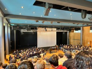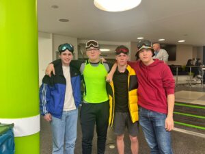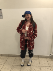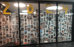 The glass wall of the hub is decorated with photos of the 2024 class throughout their highschool years. The photos are informal and funny. (Jacob N./Buchhof Bulletin)All the seniors sit in the PAC with matching sweaters. This is their last assembly and many heartfelt speeches are said. (Jacob N./Buchhof Bulletin)Sophia C., Grade 12, and Arita A., Grade 12, pose for a photo in front of Sophia’s decorated car. (Jacob N./Buchhof Bulletin)Nate O., Grade 12, and Dries F., Grade 12, pose with two friends in their apres ski outfits. This is a part of their spirt week. (Jacob N./Buchhof Bulletin)Clara R., Grade 12, holds her fake pregnant belly on rebel day. Many students were seen with fake mustaches, sweats and backwards hats. (Jacob N./Buchhof Bulletin)The finished “class of 2024” wall will everyones signatures. (Jacob N./Buchhof Bulletin)