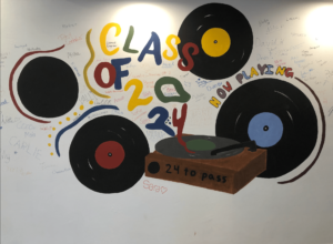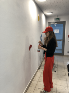 Orly S., Grade 12, paints the 2024 wall in the senior school building at MIS. It is a tradition for seniors to paint a wall before they leave. (Jacob N./Buchhof Bulletin)