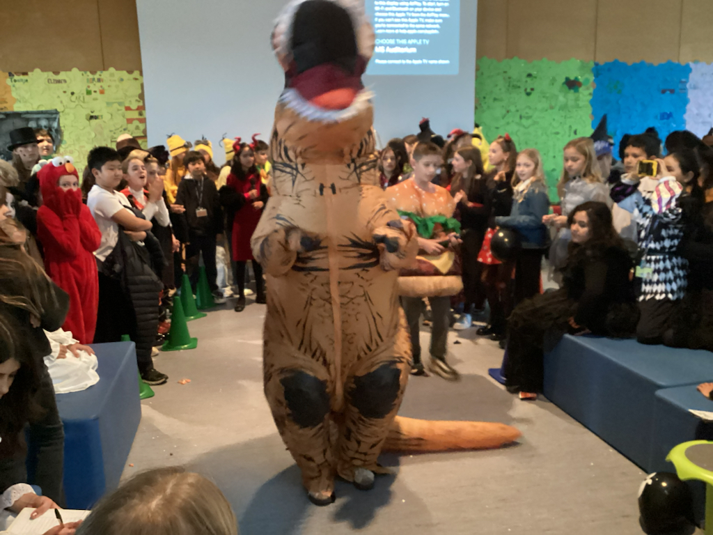 Frogger struts its stuff in the Middle School Costume Contest (Photo By: Tyler S., Grade 8). Ms. Wardle as a TY Beanie Baby (Photo By: Ben I., Grade 8).Ms. Healy is everyone’s favorite witch (Photo By: Ben I., Grade 8).Ben B., Grade 6, spooks out the school (Photo By: Ben I., Grade 8).Jonah L., Grade 8, dances off with a dinosaur (Photo By: Tyler S., Grade 8).The party never stops on Halloween! (Photo By: Tyler S., Grade 8)