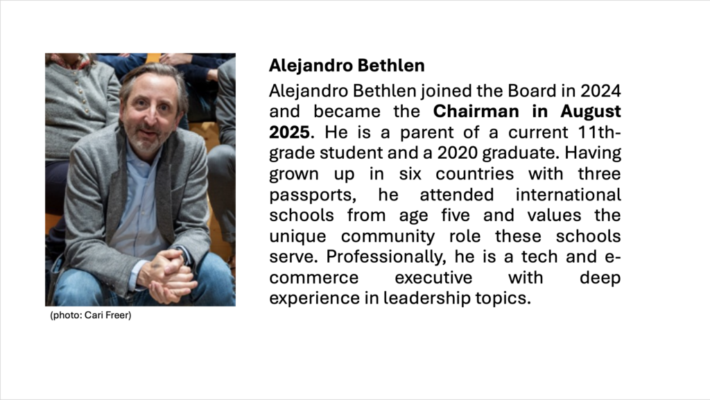 “The Board focuses on long-term directions. Day-to-day decisions are led by the Head of School and leadership team,” Board Chair Alejandro Bethlen explained.