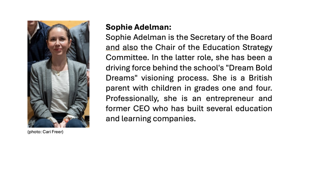 “When I sit on the Board, I take my parent’s hat off and I put my Board hat on. In that role, my job is to think about the school as a whole,” said Board Secretary and Chair of the Education & Strategy Committee Sophie Adelman.