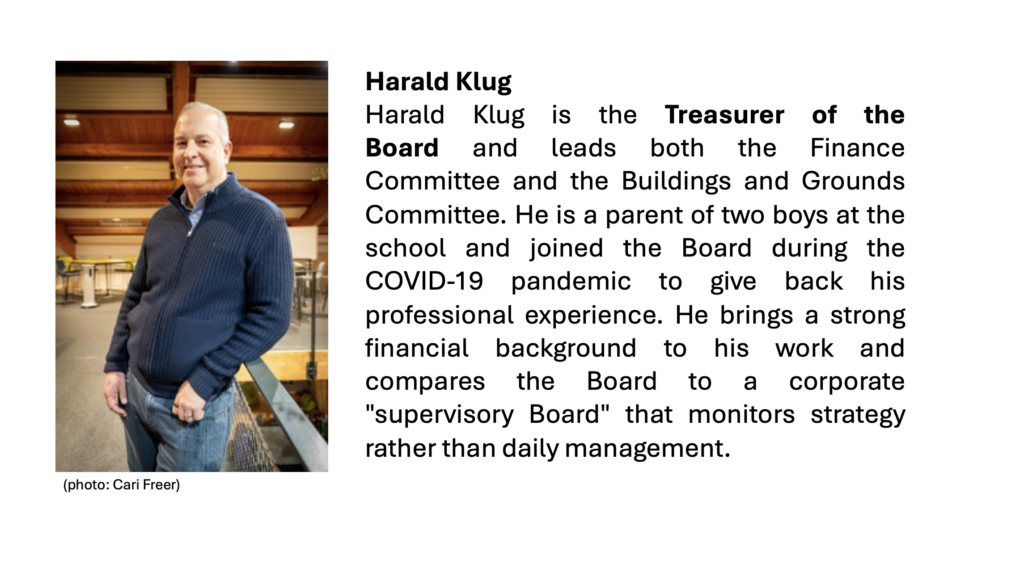 Who are the people making those long-term calls? They are a group of 12 volunteer parents who bring a variety of professional skills and expertise, such as tech, finance, human resources, or law. Almost all members have children enrolled at the school, which gives them a personal connection to our community.