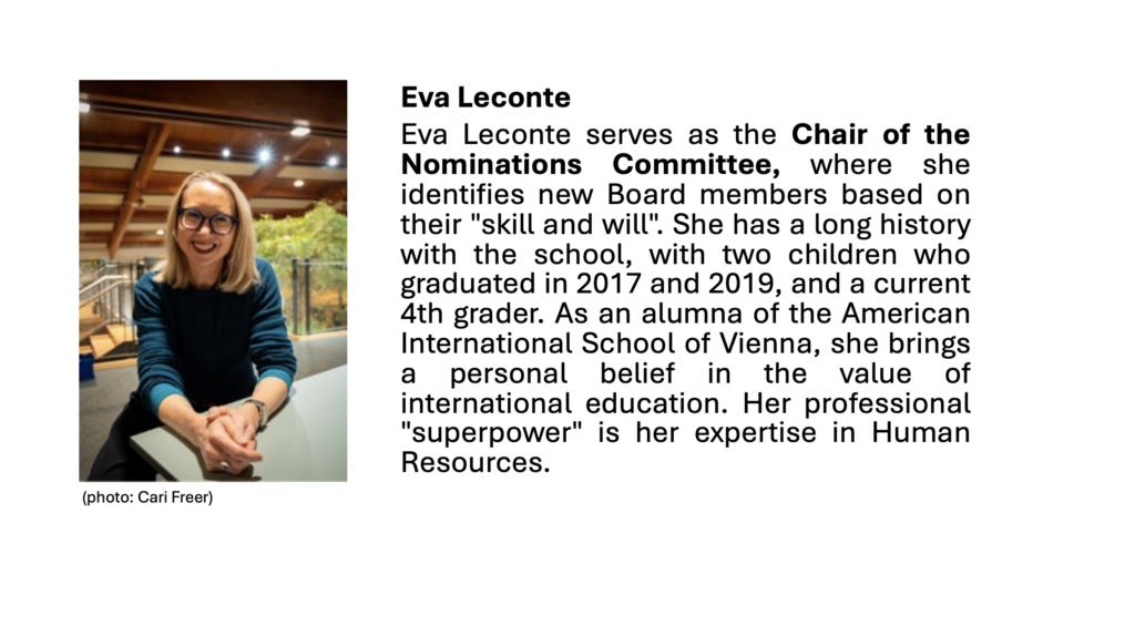 The MIS community is very diverse, with many of the students, teachers and parents coming from different nationalities backgrounds and skills. That diversity of experience is exactly what the Board hopes to reflect, as Eva Leconte explains: