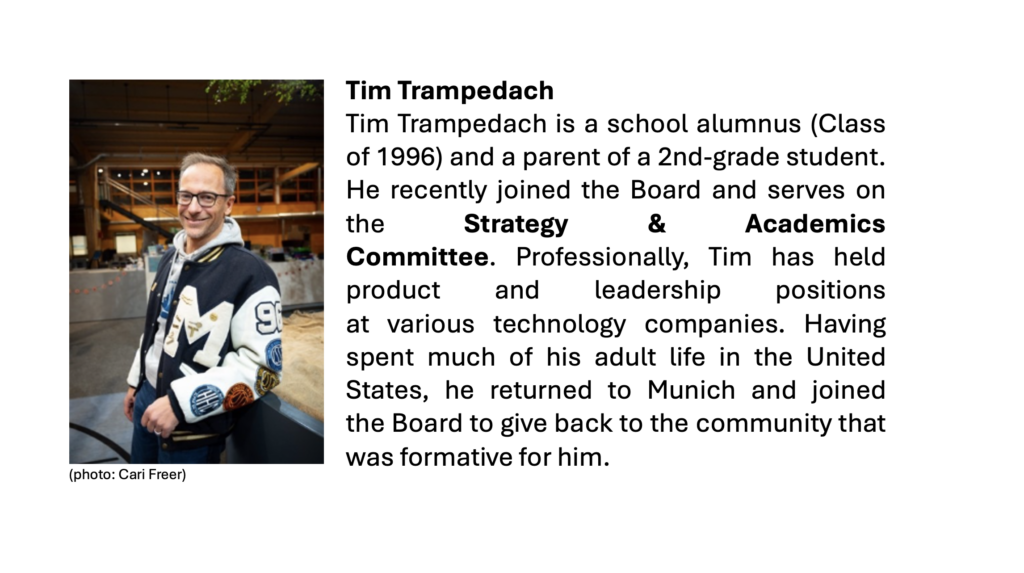 That’s why the School Board is looking for YOU! If you are a parent of an MIS student, are passionate about the future of MIS, have leadership experience, and can comfortably communicate in English, you are perfect for this role and you should apply for one of the Board member roles. The application deadline is March 10, with interviews scheduled for early April. Please send an email directly to the Chair of the Nominations Committee, Eva Leconte: evaleconte@mis-munich.de.